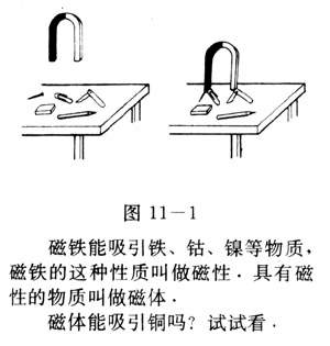 磁铁吸铁,磁针指南北.这类简单孩现象你在小学自然课里已经学过了图11-1、图11-2、图11-3至图11-4所示的现象.可以帮助你回忆起学过的知识.